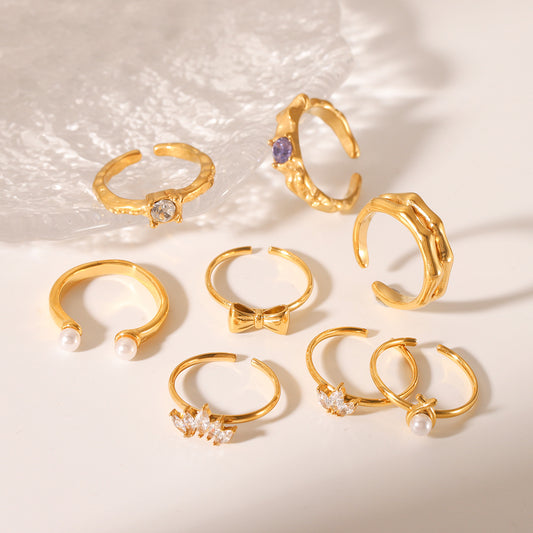18K Gold Bowknot Pearl Stainless Steel Open Ring Female Fashion Hammered Titanium Steel Zircon Ring