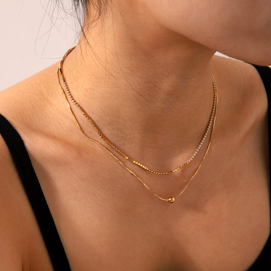 18k Gold Double-layer Necklace for Women, Stainless Steel, Fashionable and Simple Zircon Chain, High-end Necklace