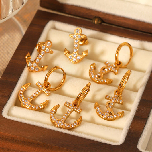18K Gold Stainless Steel Anchor Earrings with Diamond Studs, Women's Light Luxury High-end Titanium Steel Earrings
