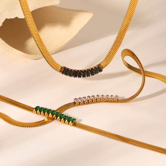 18K Gold Stainless Steel Blade Chain Inlaid with Zircon Necklace, High-end Flat Snake Chain, Titanium Steel Clavicle Chain