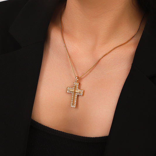 18K Gold Stainless Steel Box Chain Cross Diamond Pendant Necklace Does Not Fade, Elegant Titanium Steel Clavicle Chain