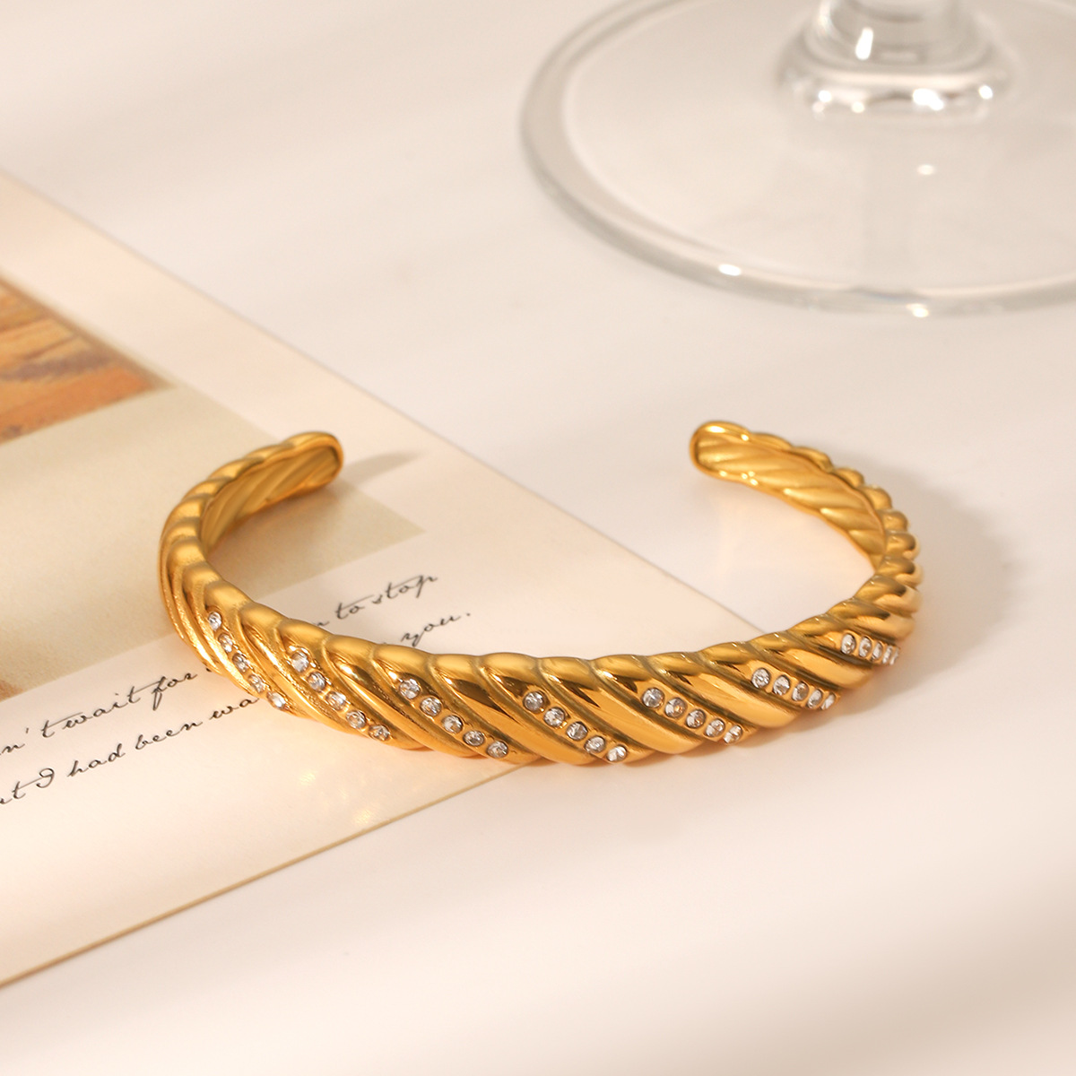 18K gold croissant-shaped stainless steel bracelet with diamond inlay, open style, women's light luxury temperament, cast bracelet, titanium steel jewelry