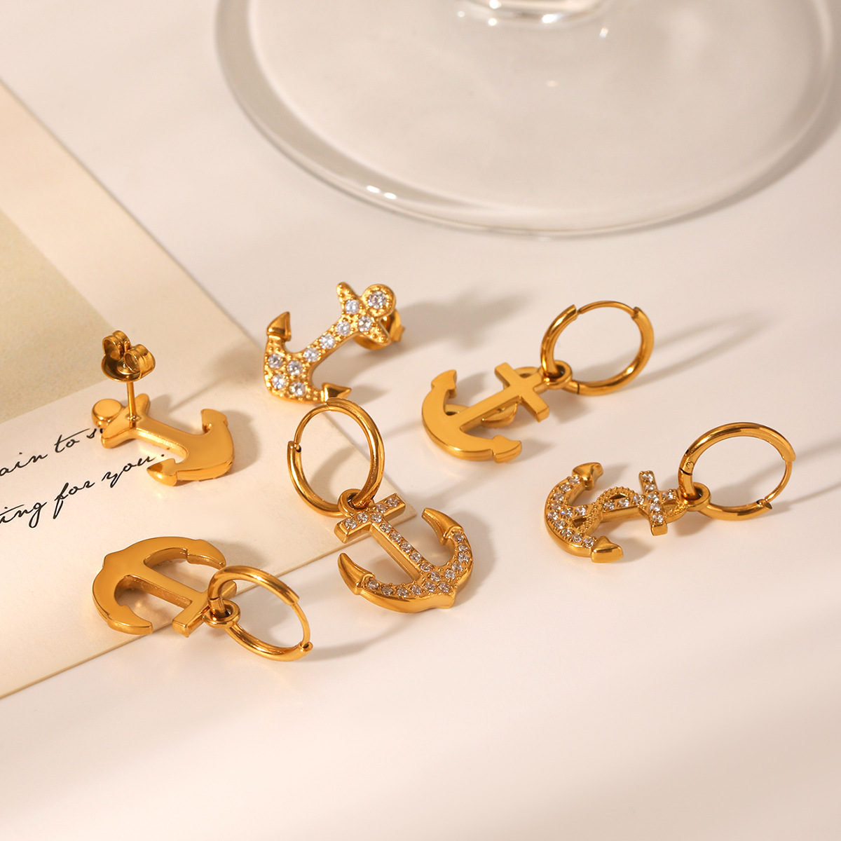 18K Gold Stainless Steel Anchor Earrings with Diamond Studs, Women's Light Luxury High-end Titanium Steel Earrings