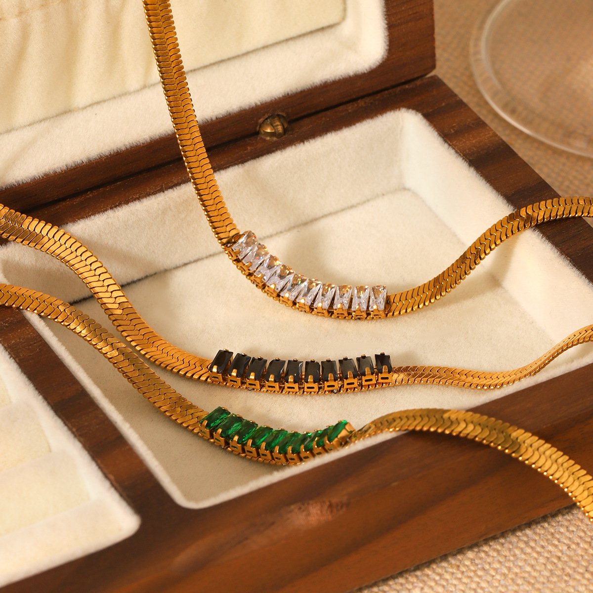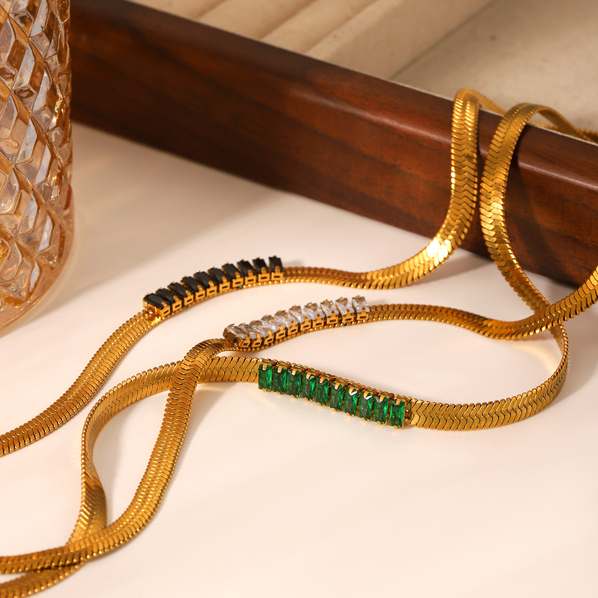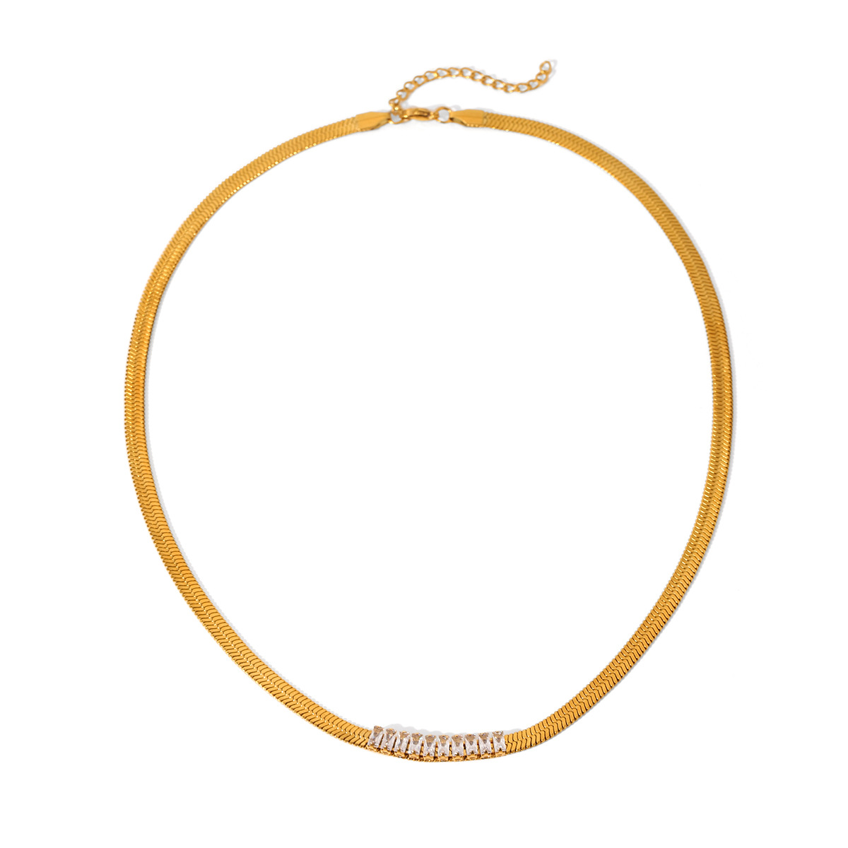 18K Gold Stainless Steel Blade Chain Inlaid with Zircon Necklace, High-end Flat Snake Chain, Titanium Steel Clavicle Chain