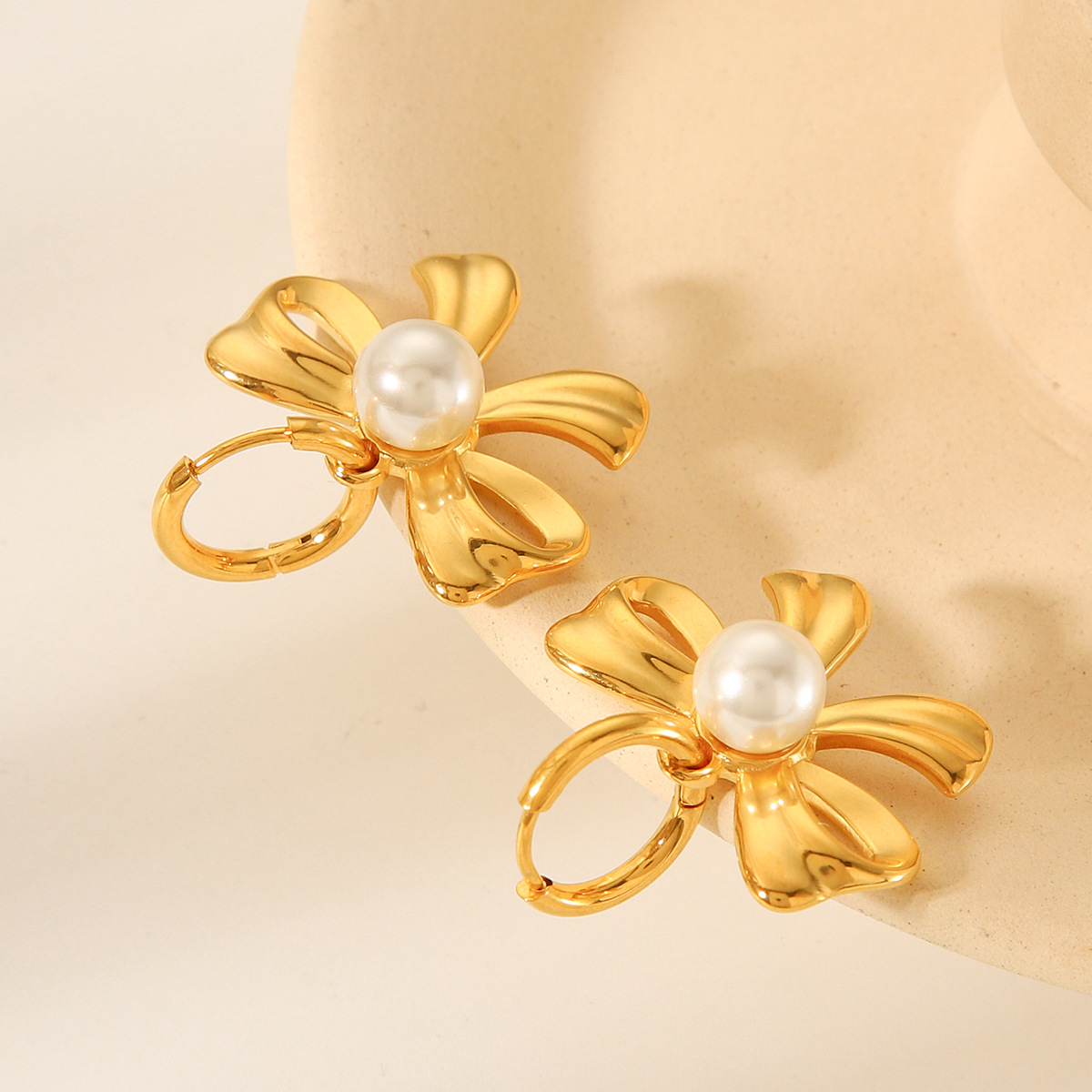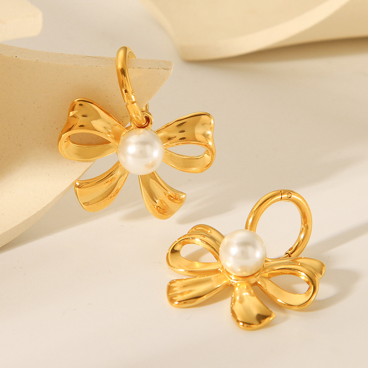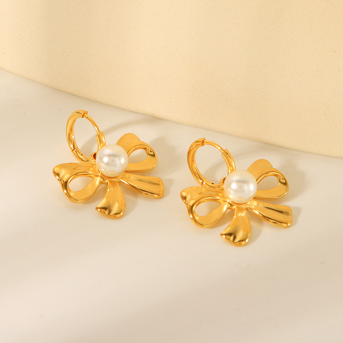 18K Gold Stainless Steel Bow Pearl Pendant Earrings for Women's Fashion Temperament Titanium Steel Earrings