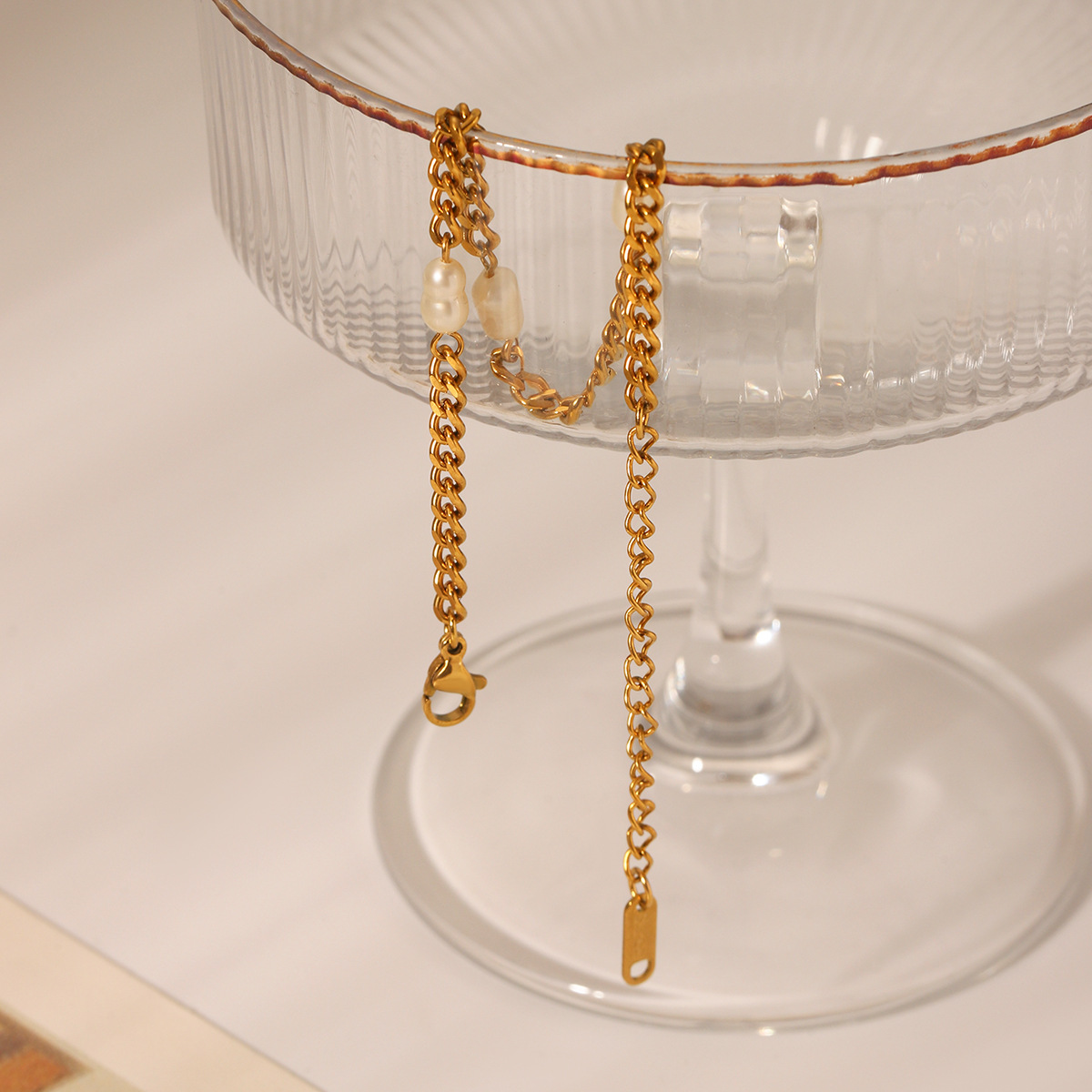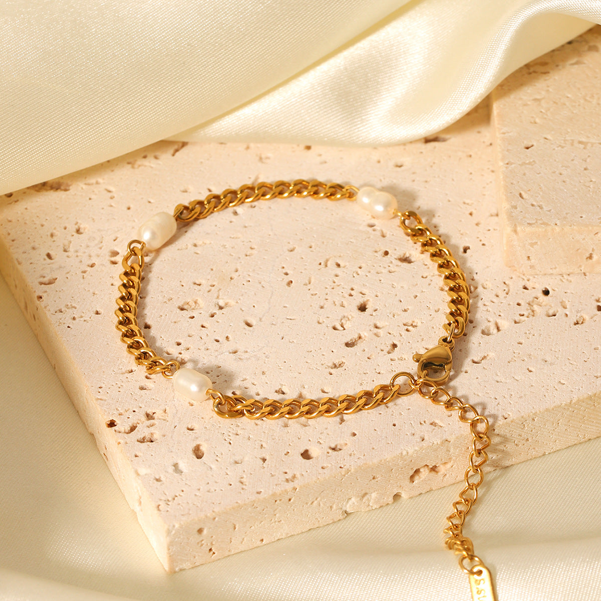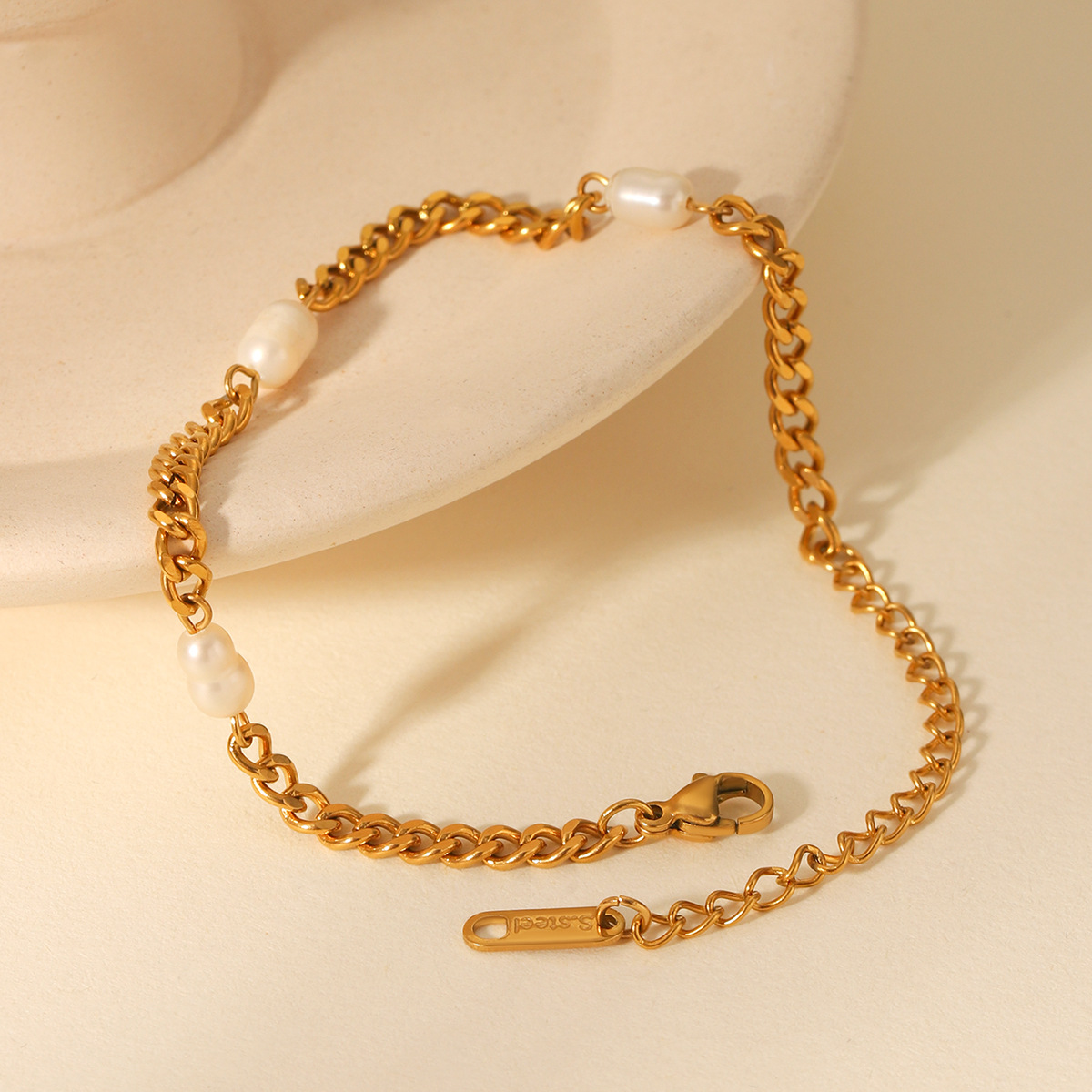 18K Gold Stainless Steel Cuban Chain Freshwater Pearl Bracelet for Women, Ins-inspired Elegant Jewelry, Titanium Steel Accessory