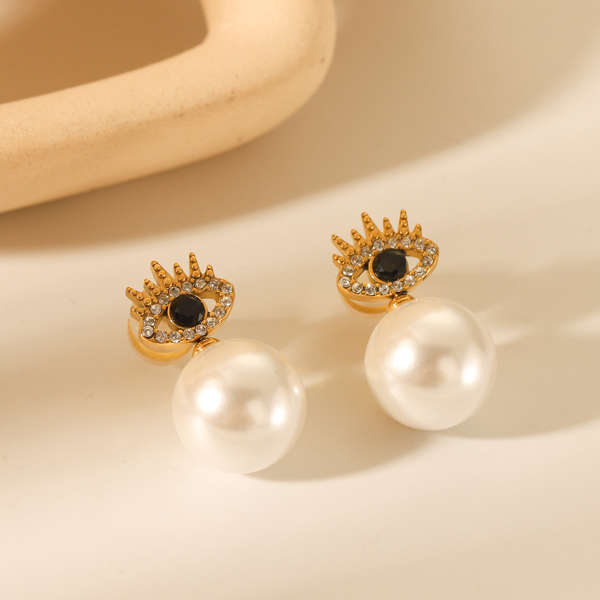 18K gold stainless steel diamond-encrusted eye earrings for women, fashionable, personalized, trendy, pearl earrings