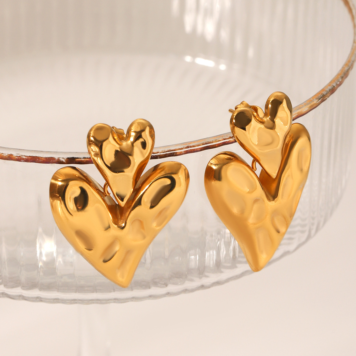 18K Gold Stainless Steel Hammered Pattern Heart-shaped Earrings, Light Luxury and High-end Feel, Heart-shaped Titanium Steel Earrings