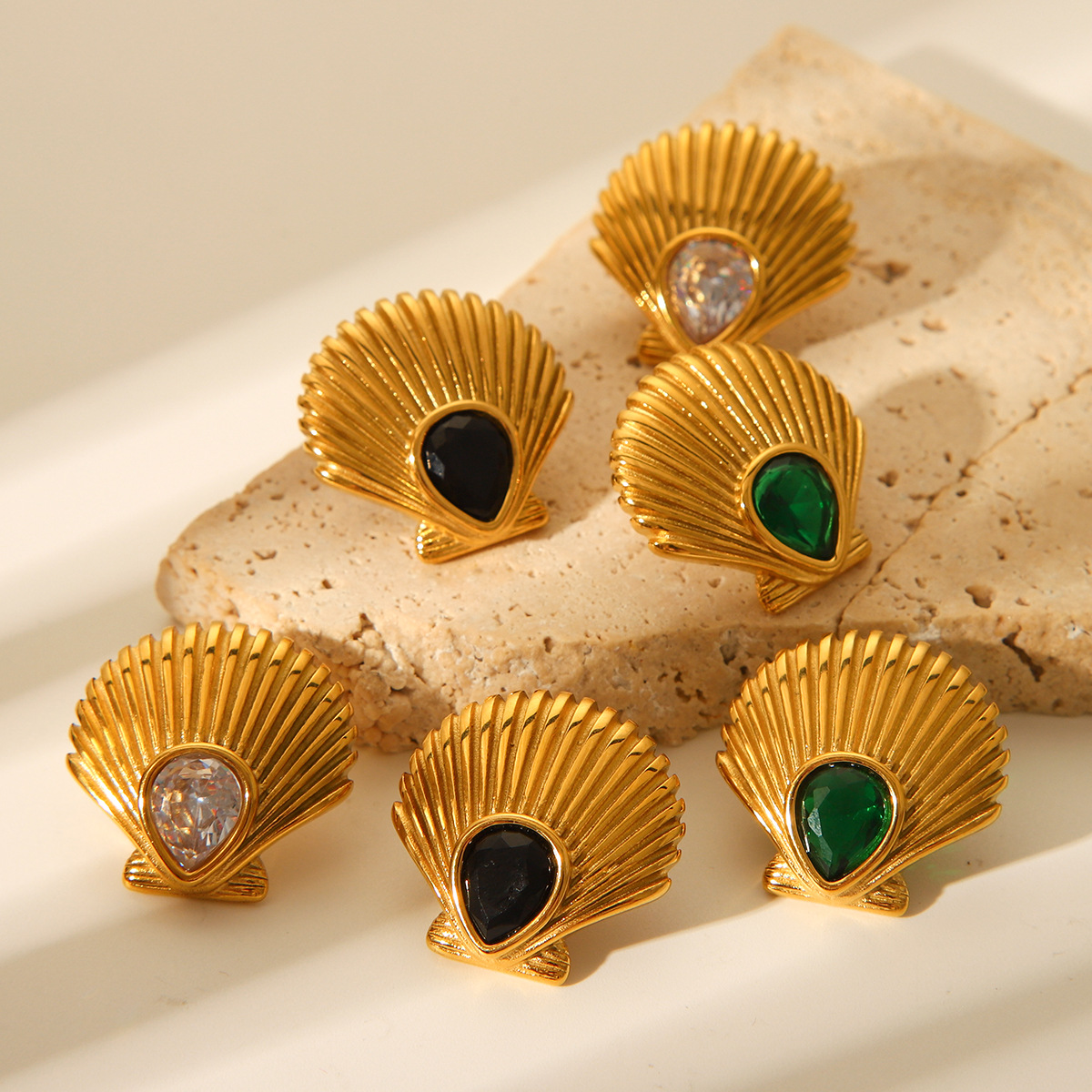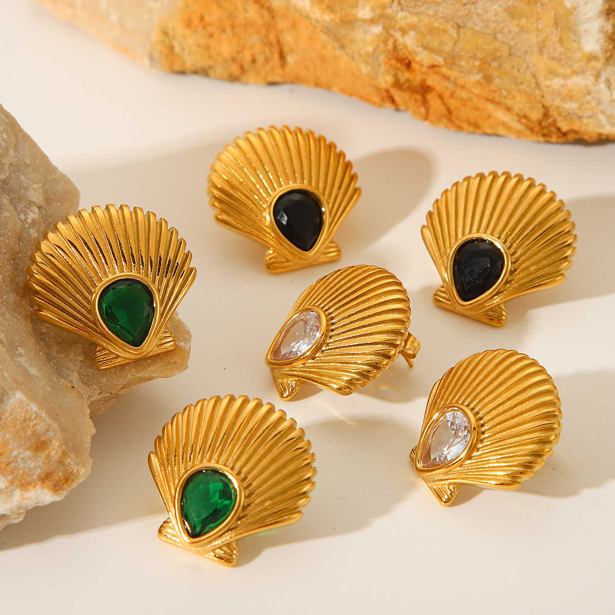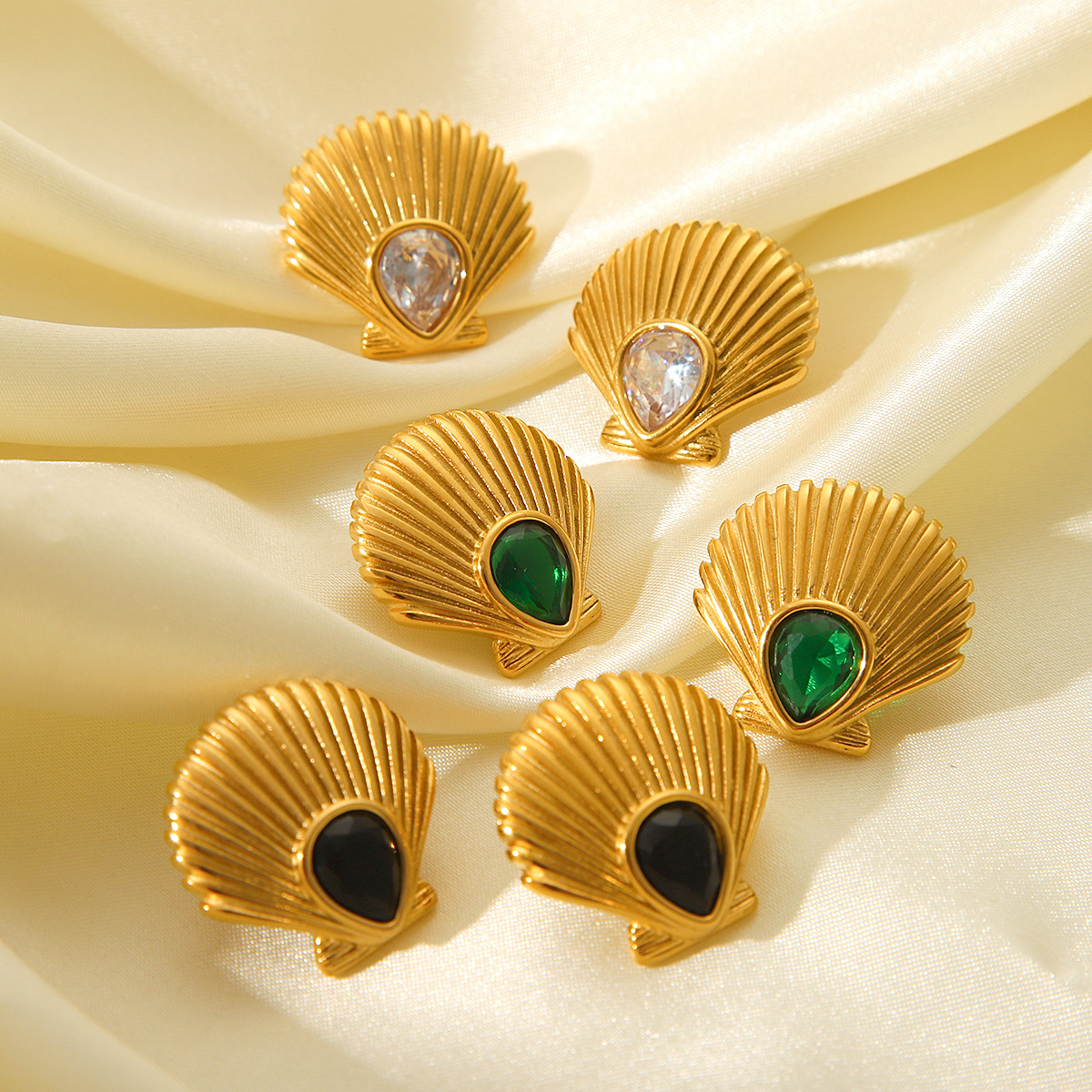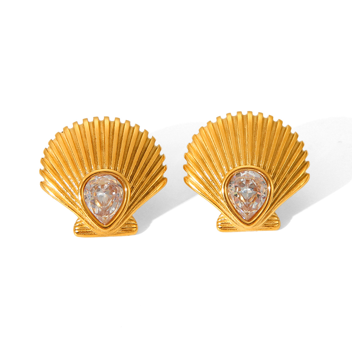 18K Gold Stainless Steel Scallop Earrings with Zircon, Women's Light Luxury, Easy-matching Earrings, Marine Titanium Steel Earrings