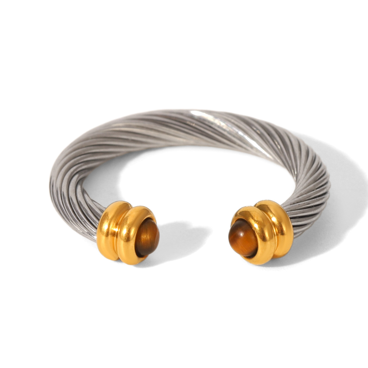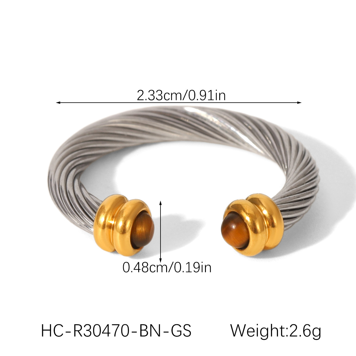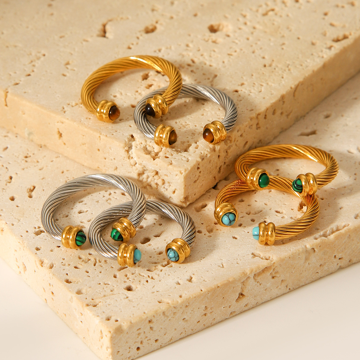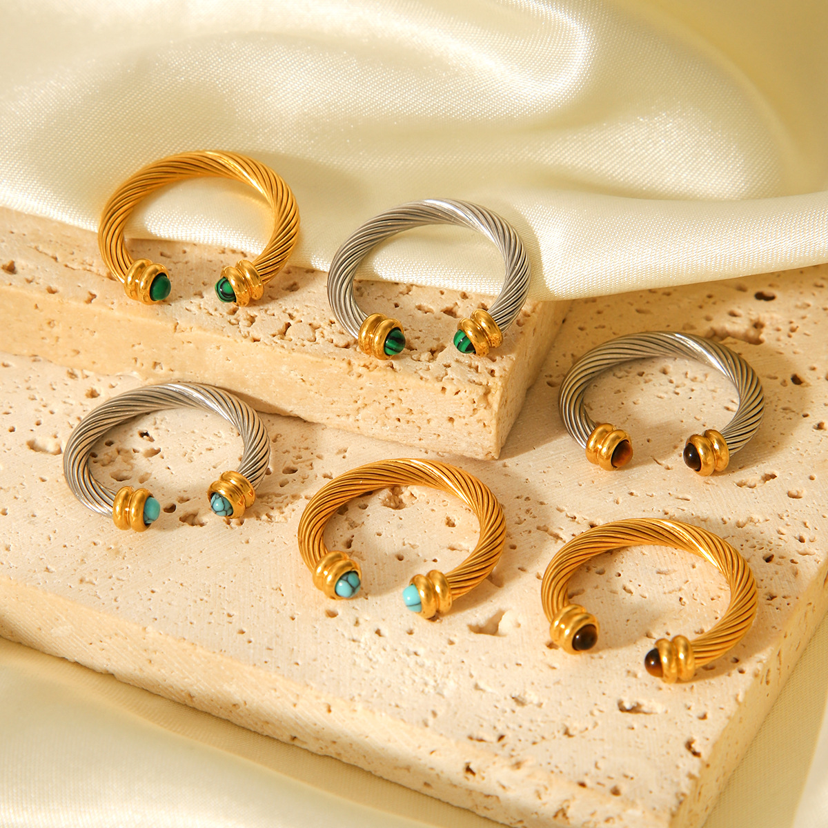 Color-blocked Stainless Steel Spiral Pattern Open Ring Inlaid with Malachite, Turquoise, Tiger's Eye, Titanium Steel Finger Ring for Women