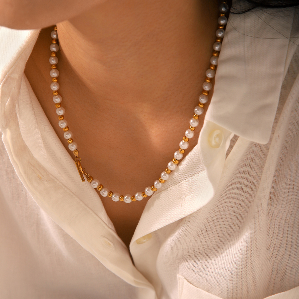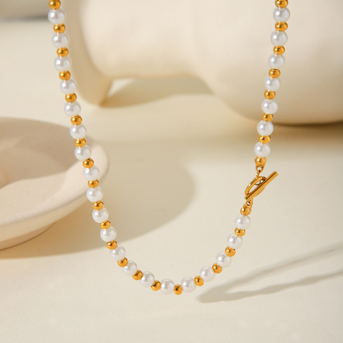 Fashionable light luxury stainless steel beaded necklace pearl necklace female ins style versatile clavicle chain