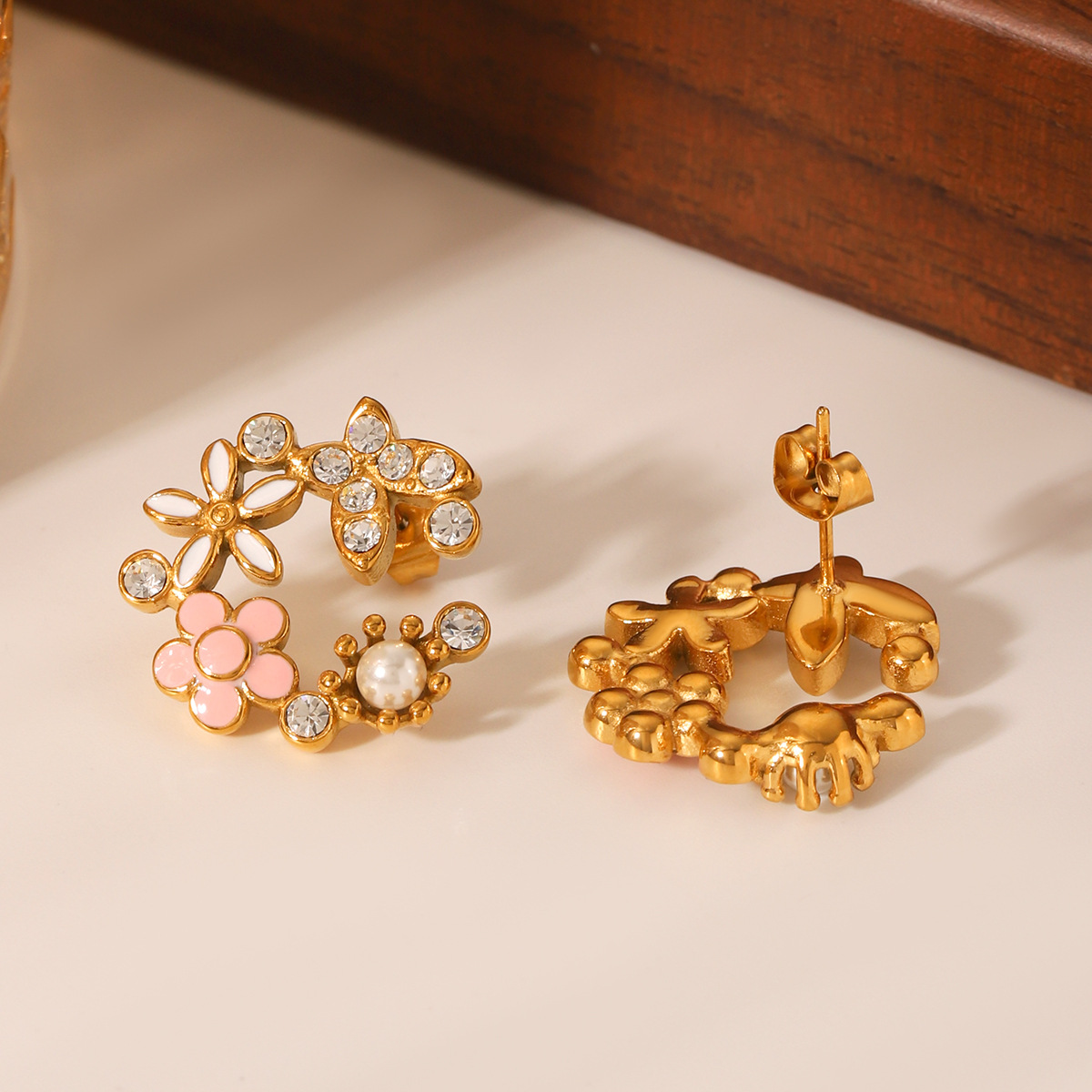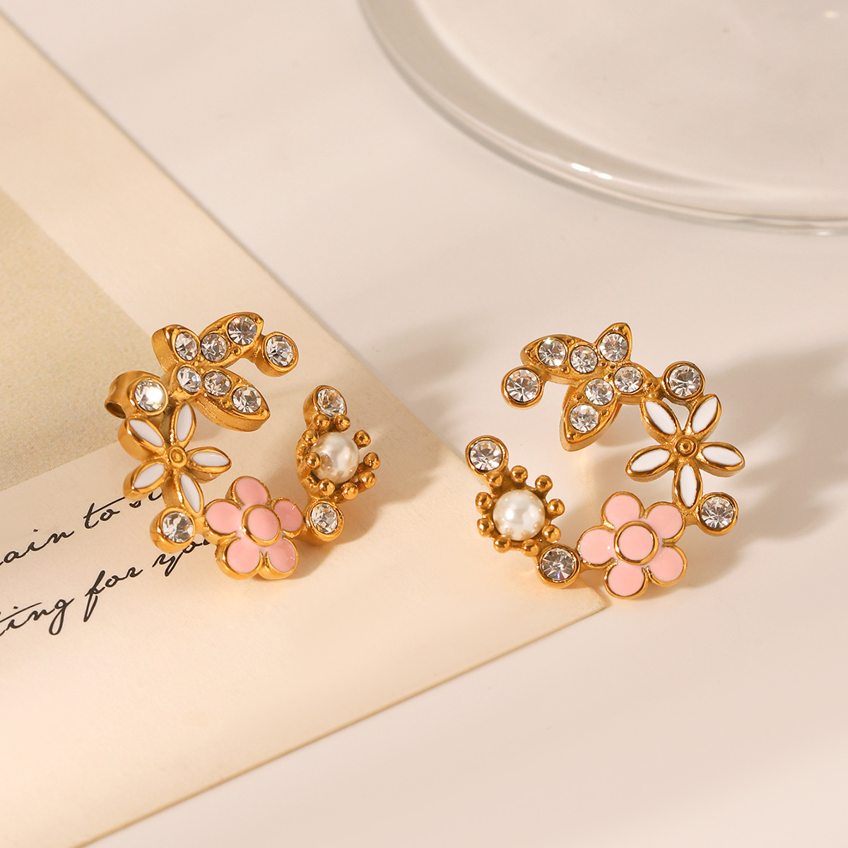 Flower earrings, 18K gold stainless steel, butterfly design with zircon, pearl drop earrings, women's flower garland earrings