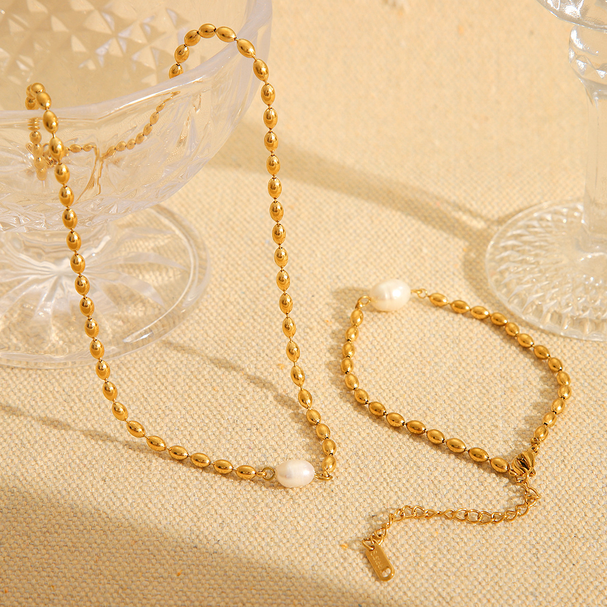 French natural freshwater pearl oval gold bean necklace stainless steel bracelet titanium steel jewelry