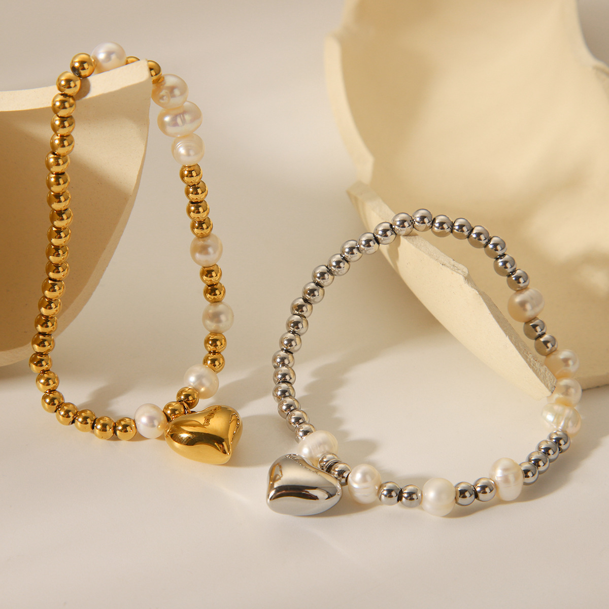INS Beaded Titanium Steel Bracelet, 18K Gold Stainless Steel Heart-shaped Pearl Bracelet, Women's Light Luxury and Versatile Jewelry