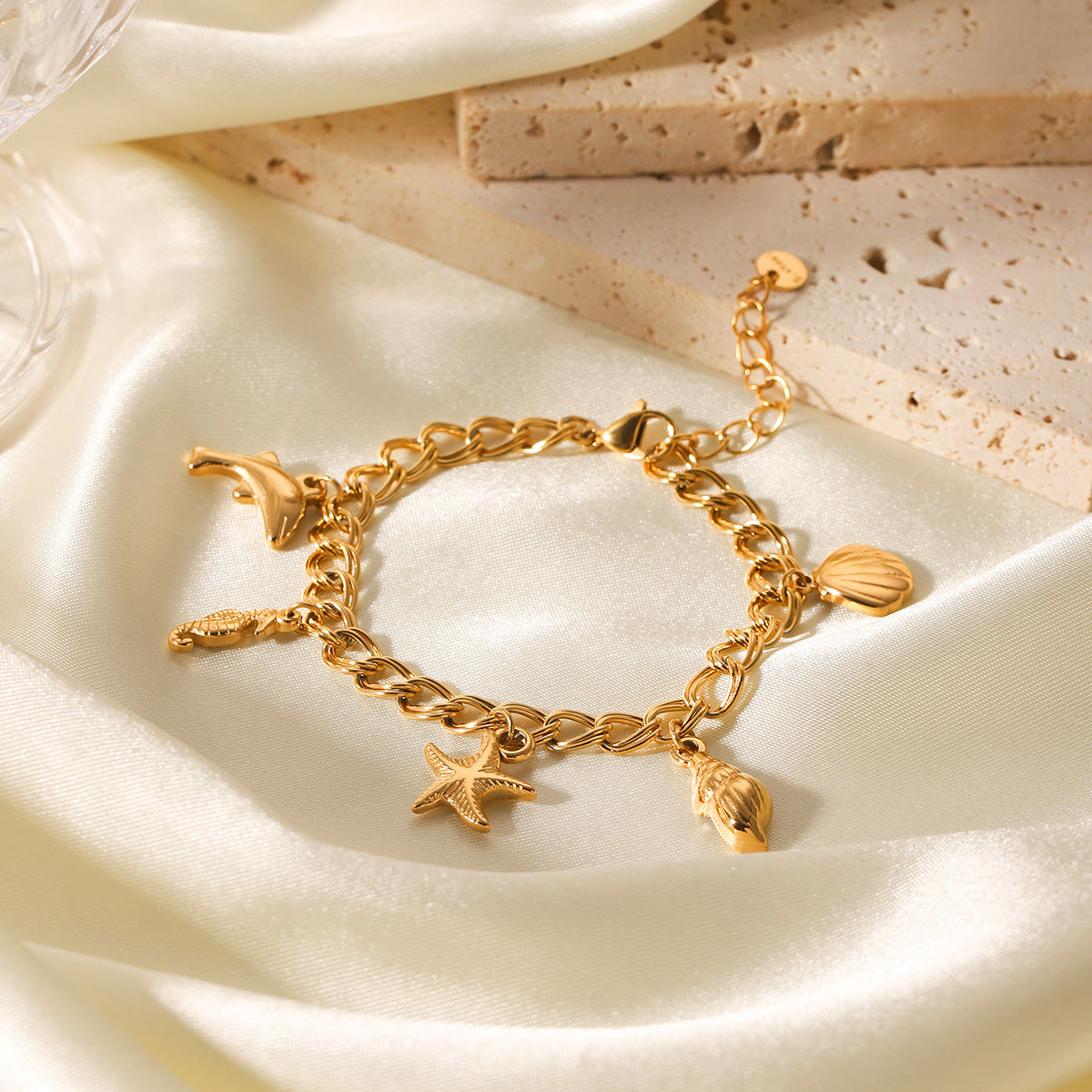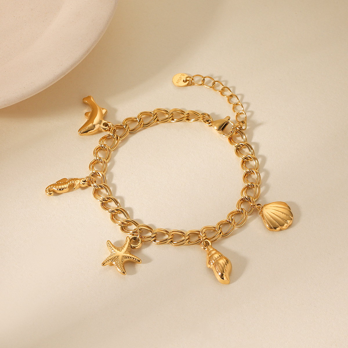 Marine Stainless Steel Bracelet with Dolphin, Seahorse, Starfish, Conch Shell, and Shellfish Pendants - Non-fading Jewelry