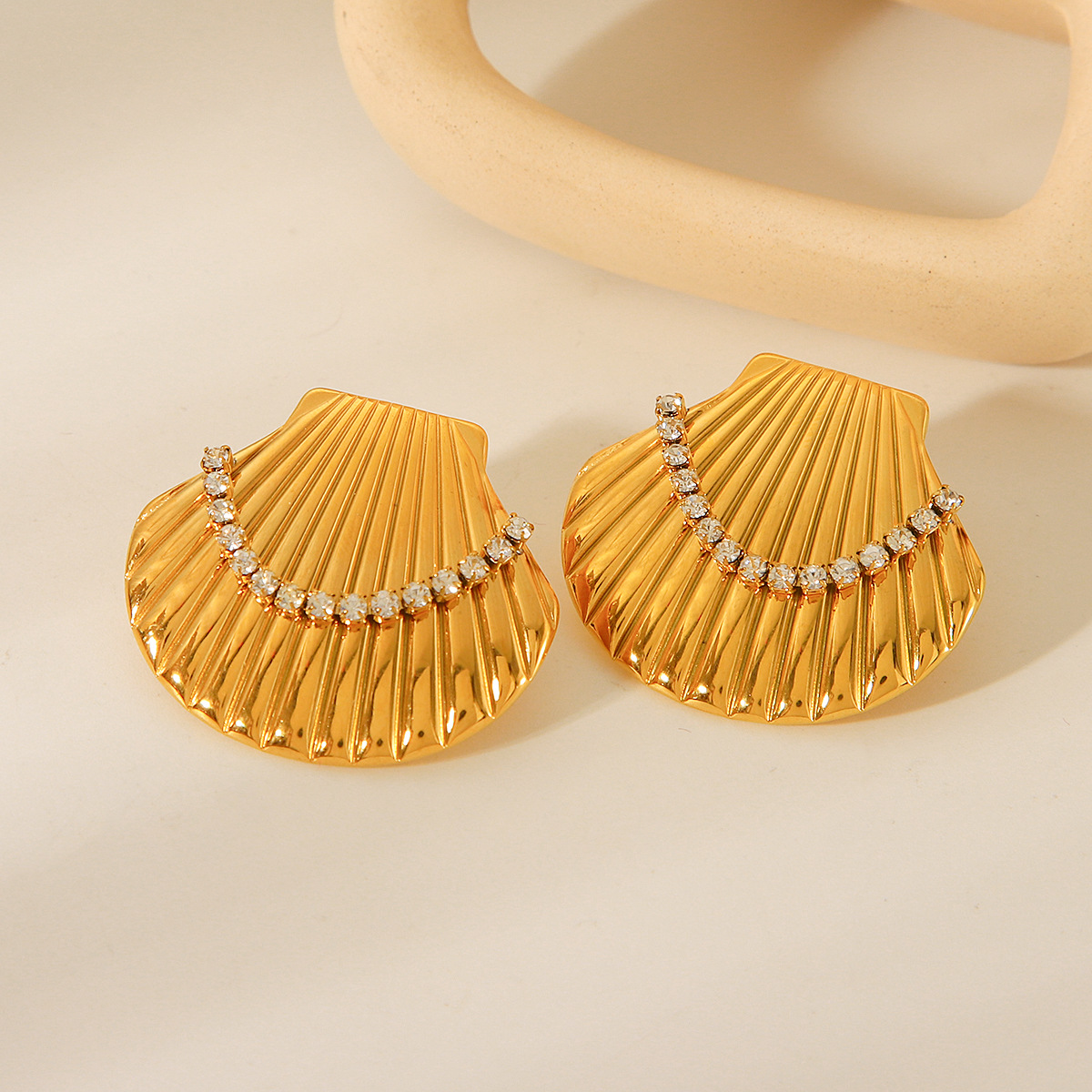 Marine titanium steel earrings, 18k gold-plated stainless steel scallop earrings, women's fashion diamond-encrusted earrings