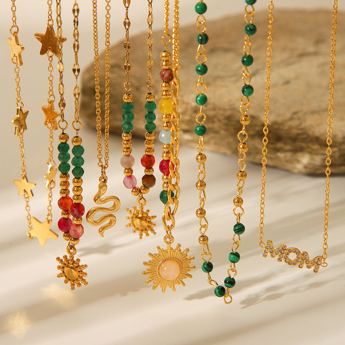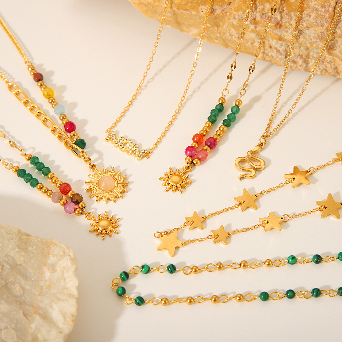 New Natural Stone Bead Titanium Steel Necklace, 18K Gold-plated Stainless Steel Sun Star Pendant Necklace for Women