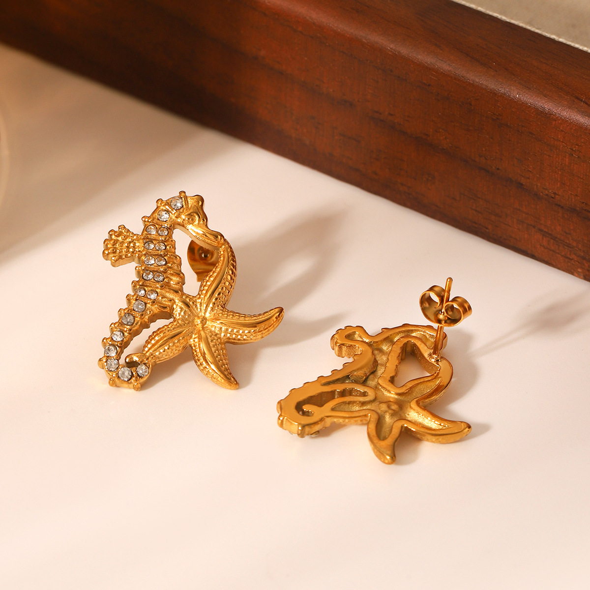 Ocean Wind Stainless Steel Diamond-encrusted Seahorse Earrings, Non-fading, Niche, High-end, Titanium Steel Starfish Earrings