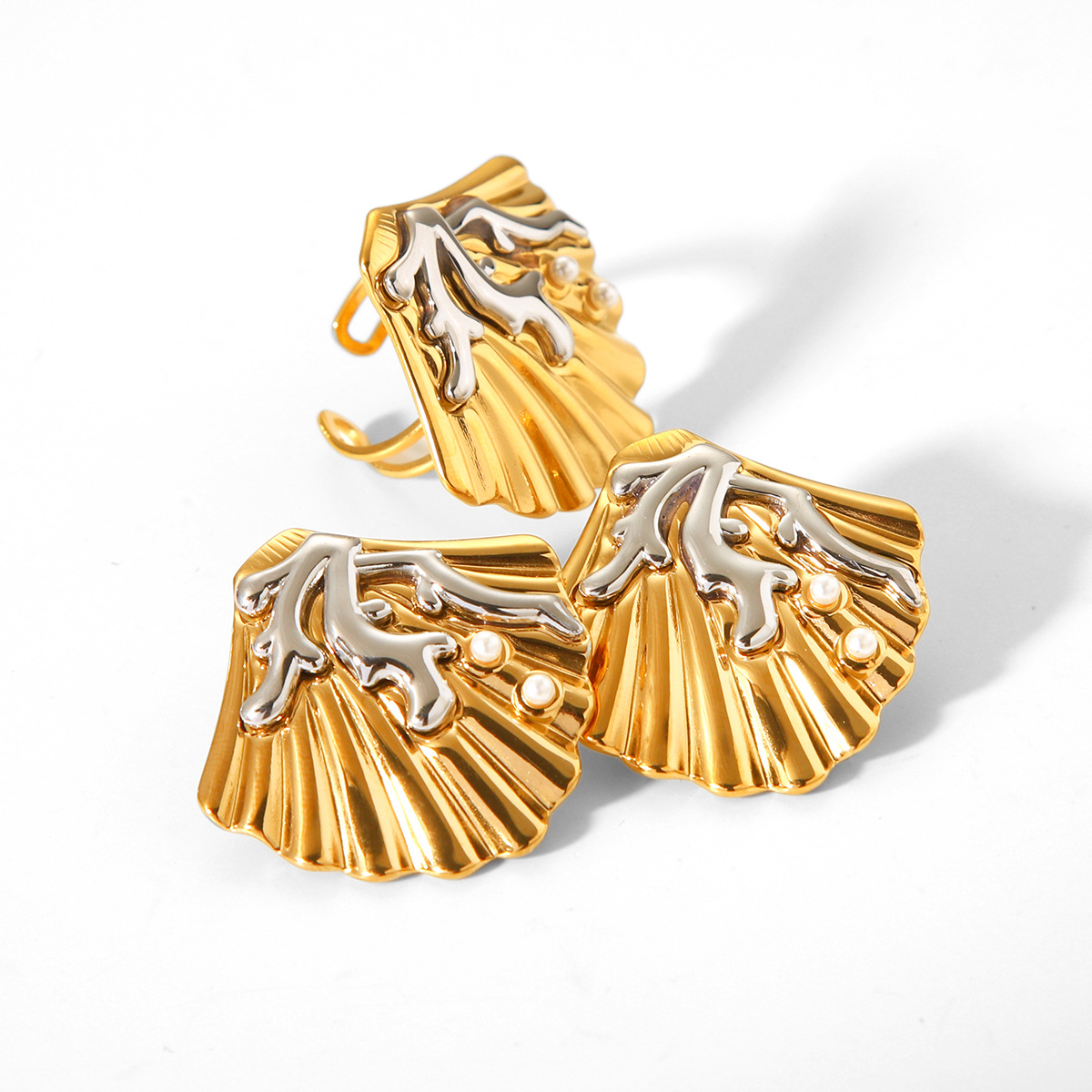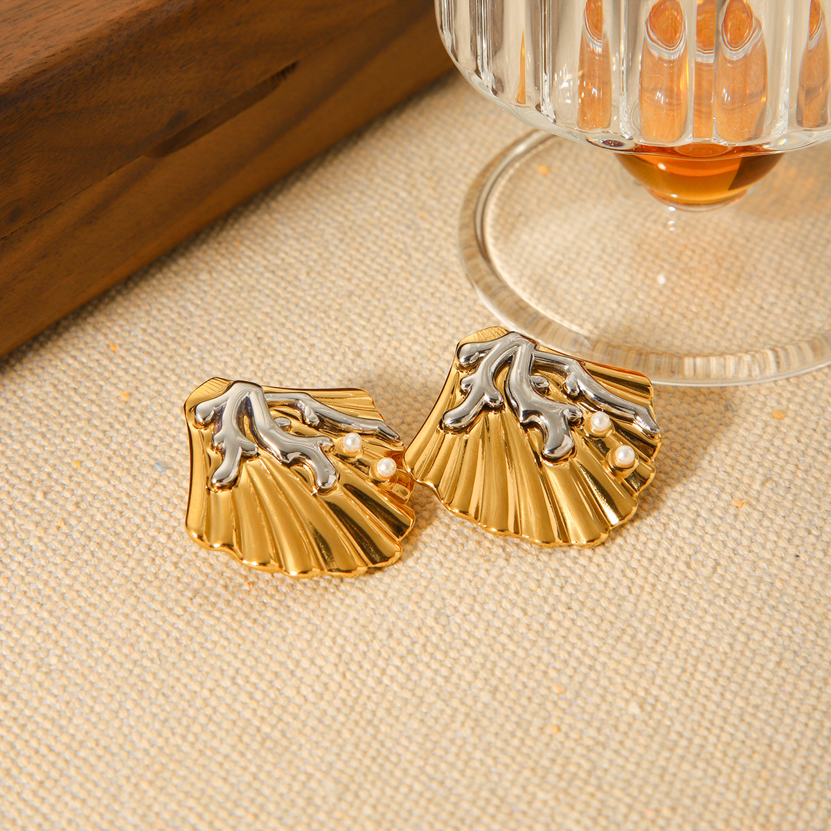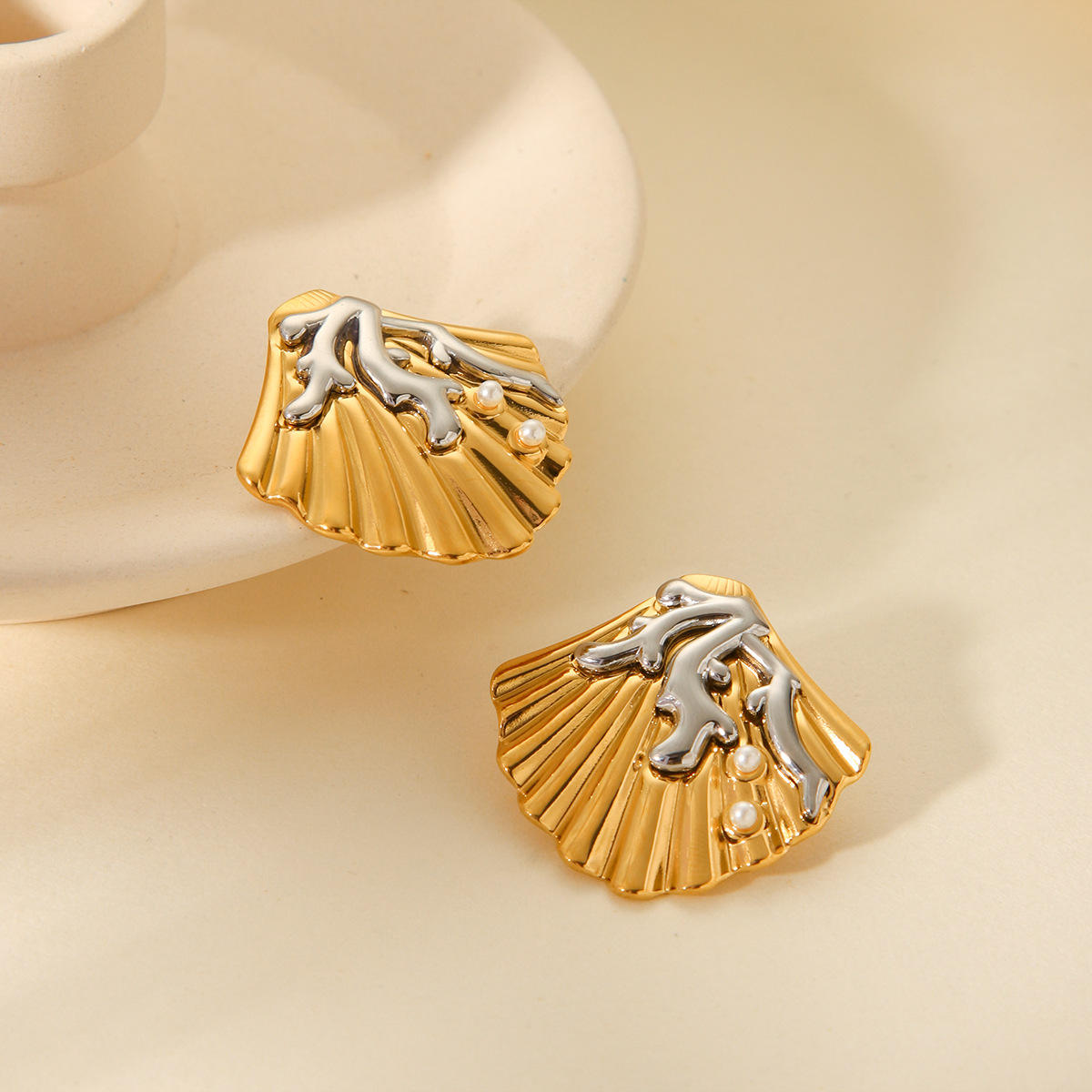 Stainless steel color-blocked ocean scenery surface coral pearl shell earrings design sense titanium steel earrings female