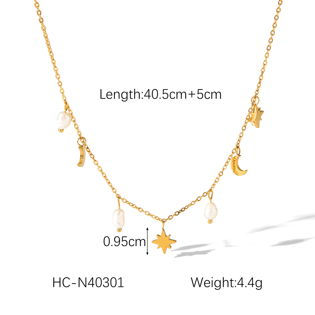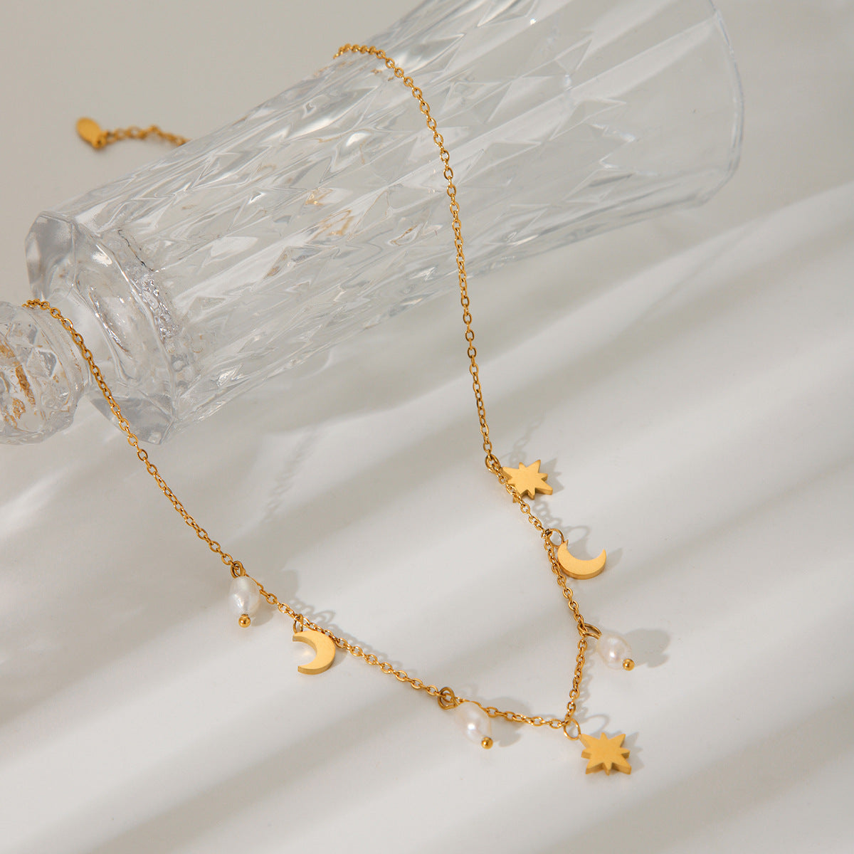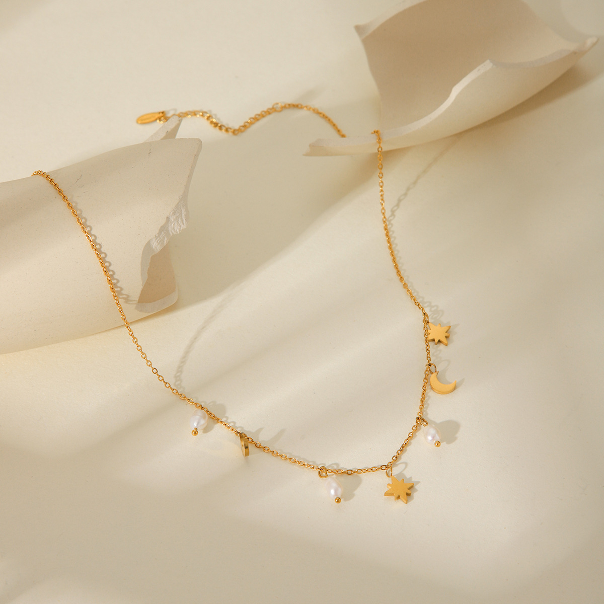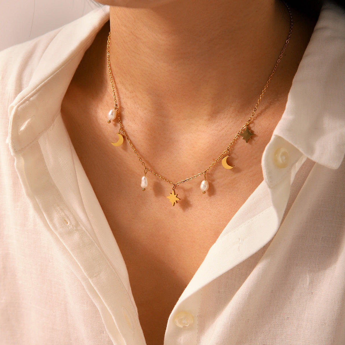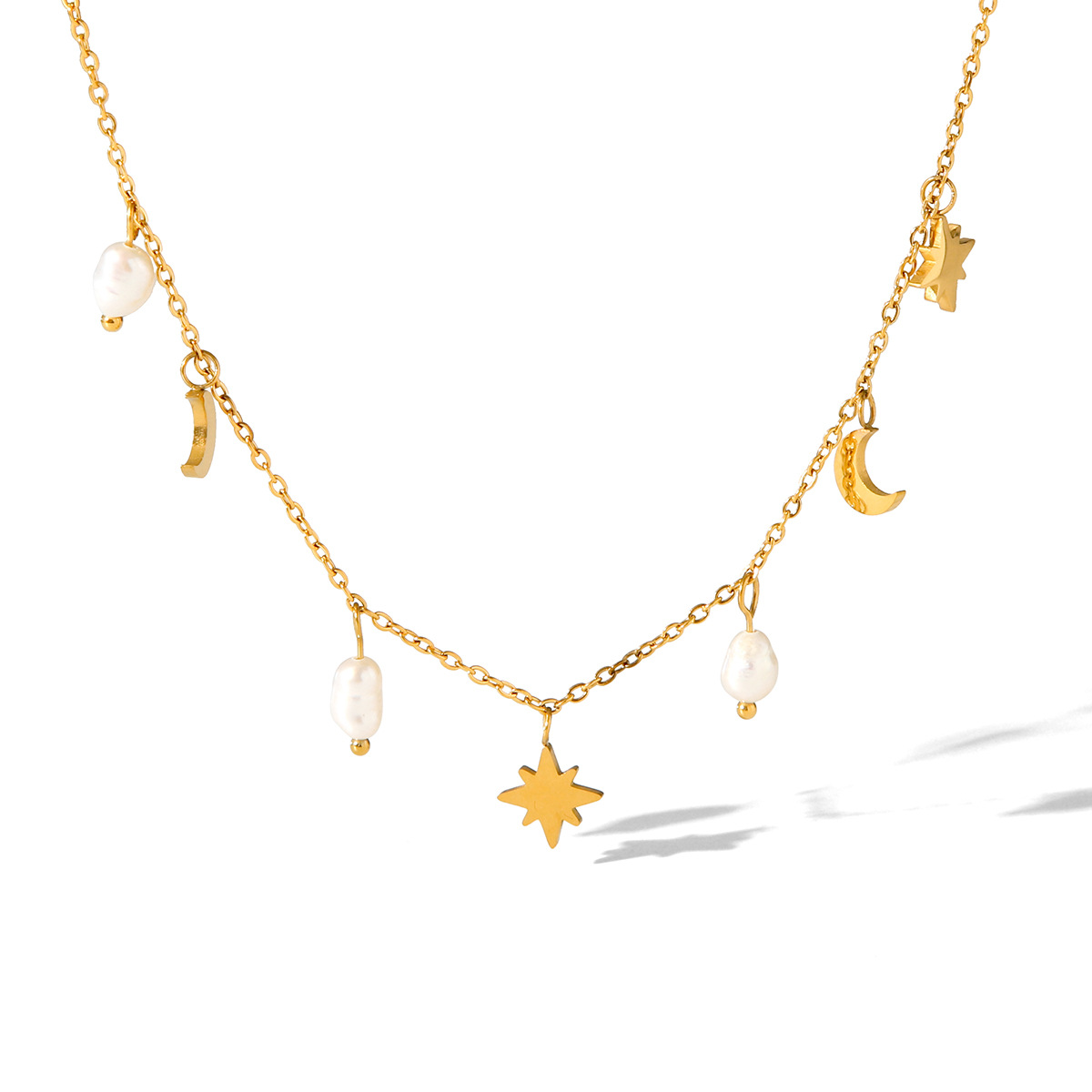 Stainless Steel Eight-pointed Star Moon Freshwater Pearl Pendant Necklace