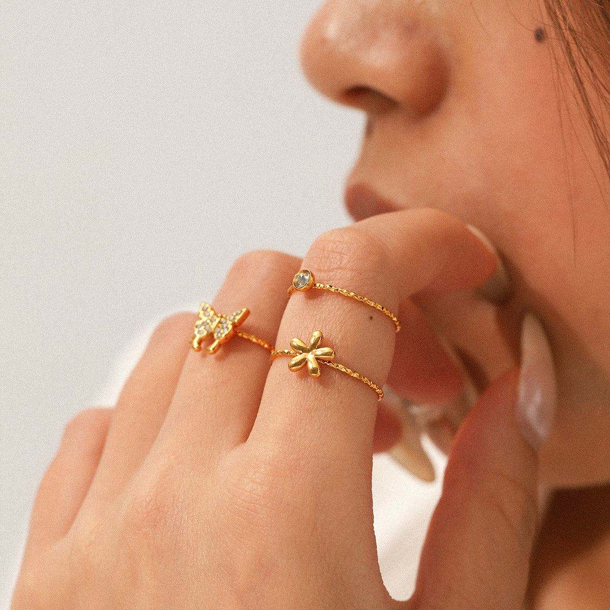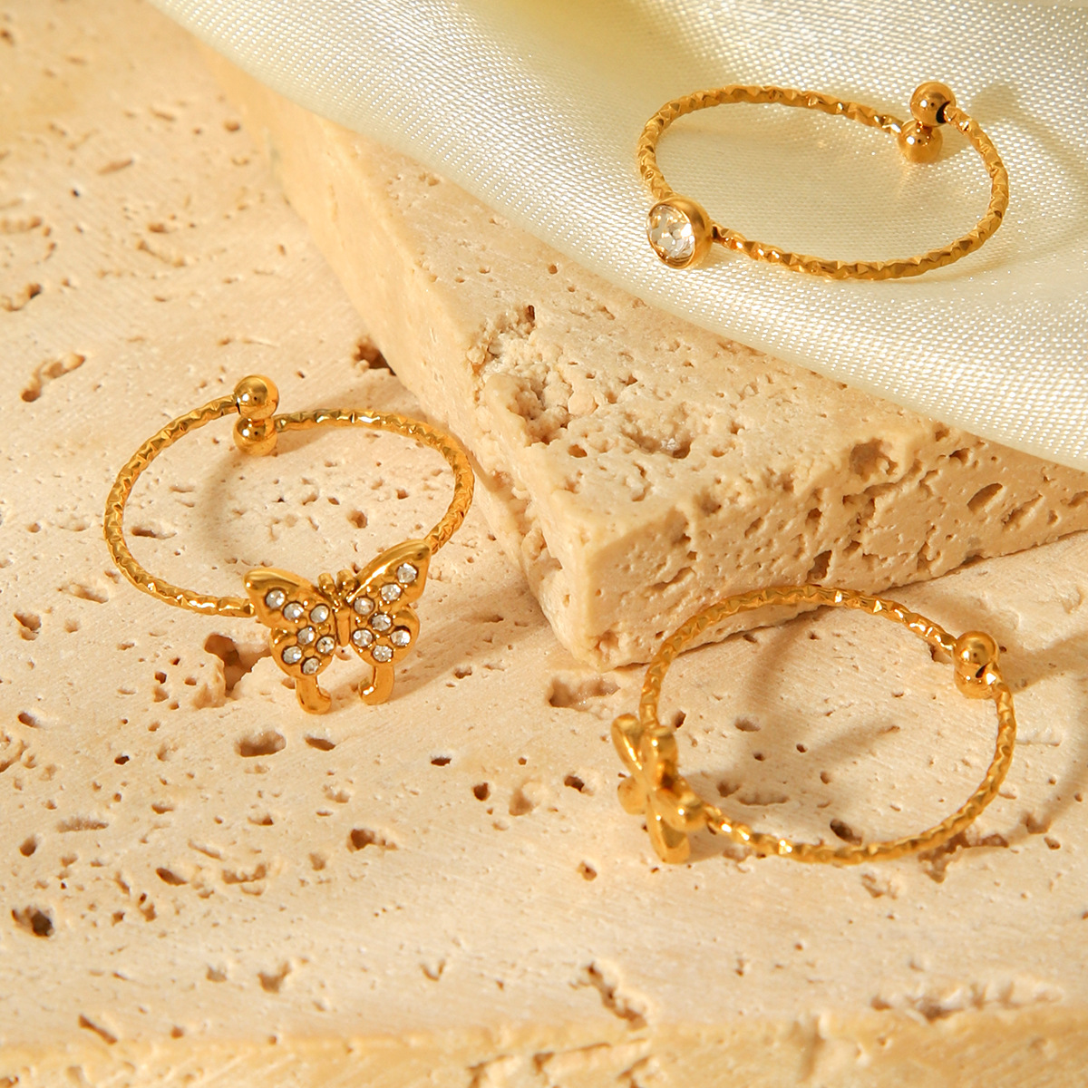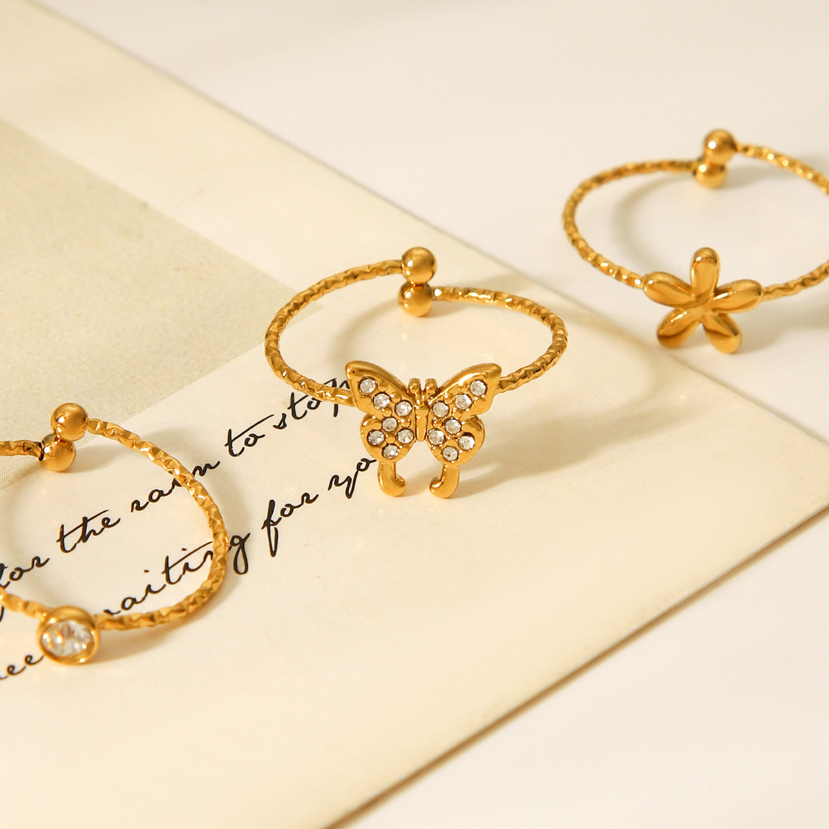 Stainless Steel Flower and Butterfly Ring Set with Diamond-encrusted Open Ring for Women, Non-fading, Stackable Finger Rings