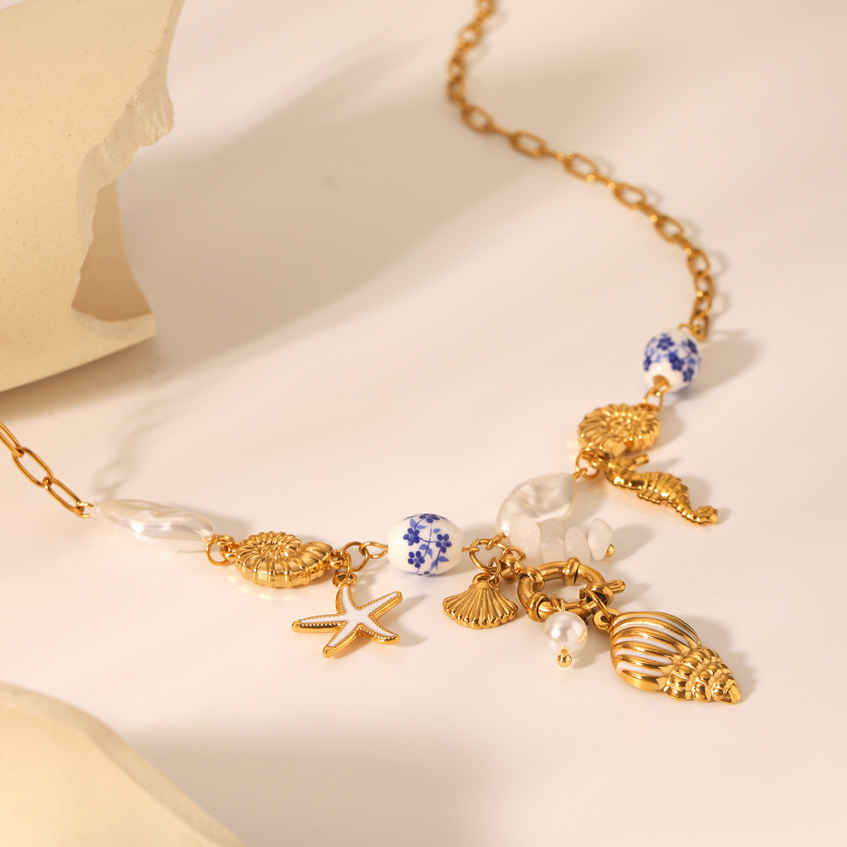 Summer Stainless Steel Ocean Style Element Starfish Shell Pearl Conch Necklace Female Non-fading Necklace
