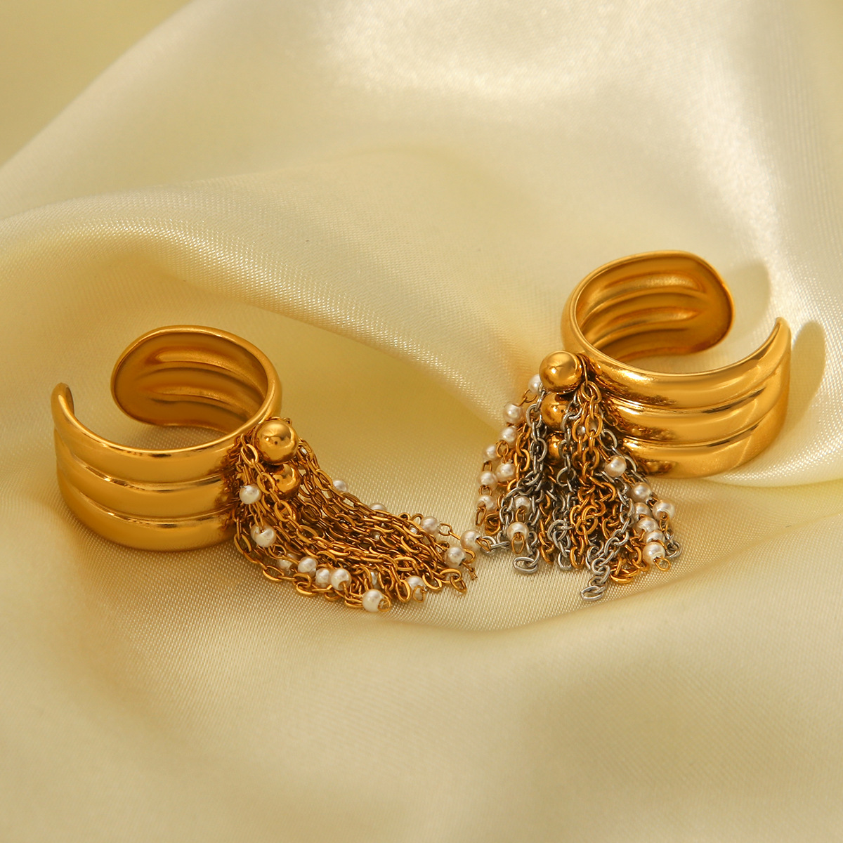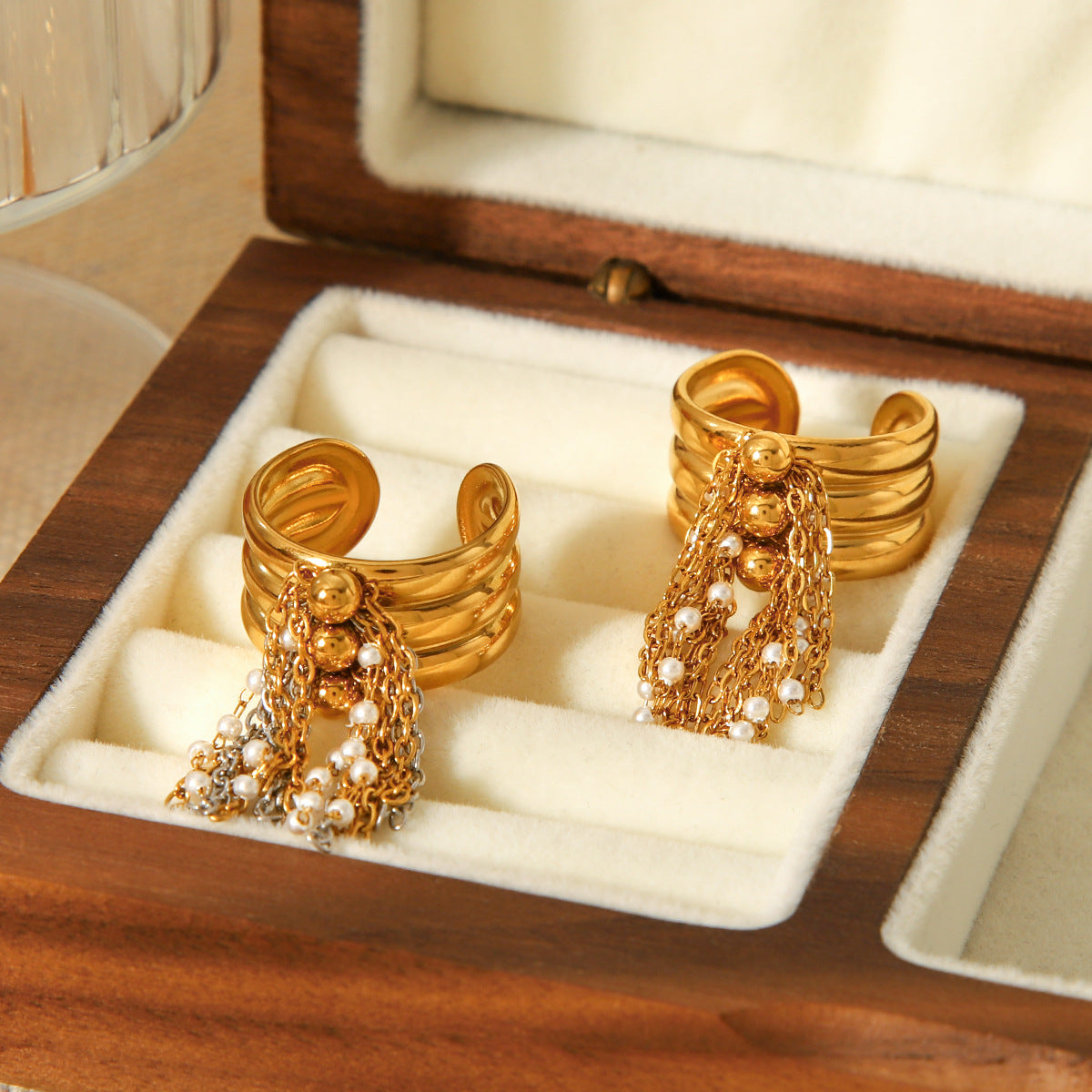 Titanium Steel Ring, 18K Gold Stainless Steel, Pearl Chain, Fringed, Open-ended, Women's Ring