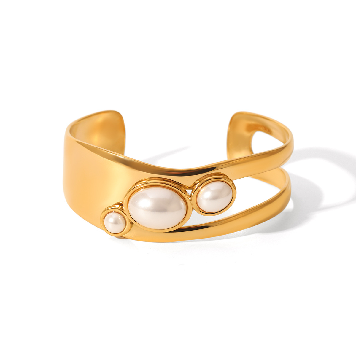 Women Stainless Steel Hollow-out Pearl Bracelet with Natural Tiger's Eye Stone, Open Bracelet, Vintage Style, Titanium Steel Jewelry