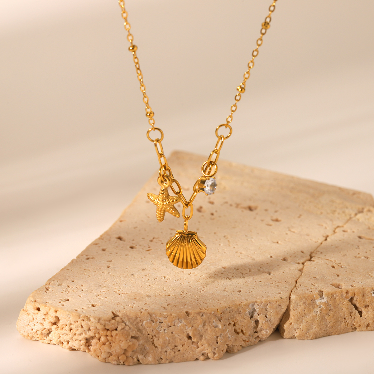 Women's Stainless Steel Starfish Shell Zircon Pendant Necklace, Niche Design, Ocean Style, Titanium Steel Clavicle Chain,